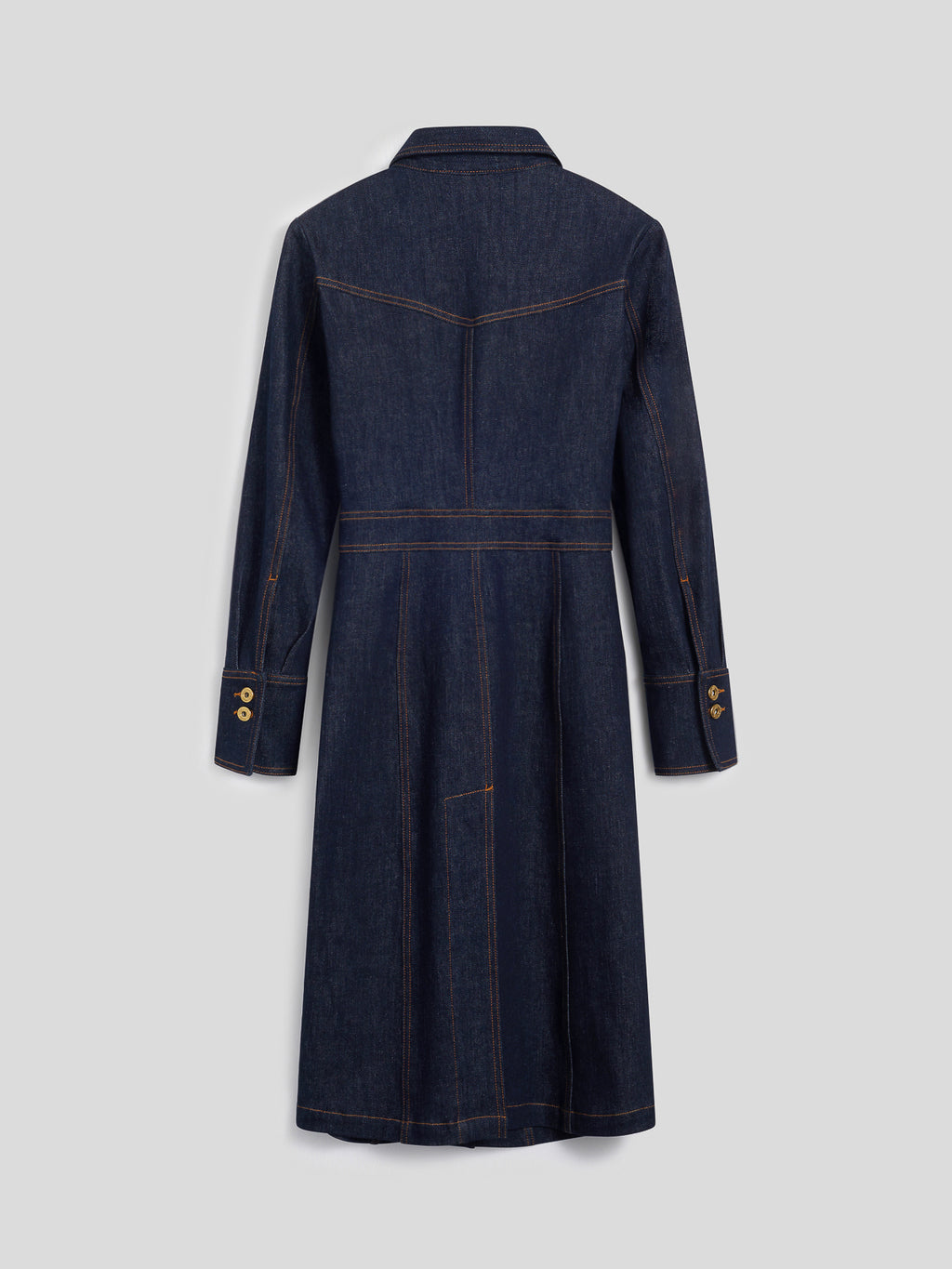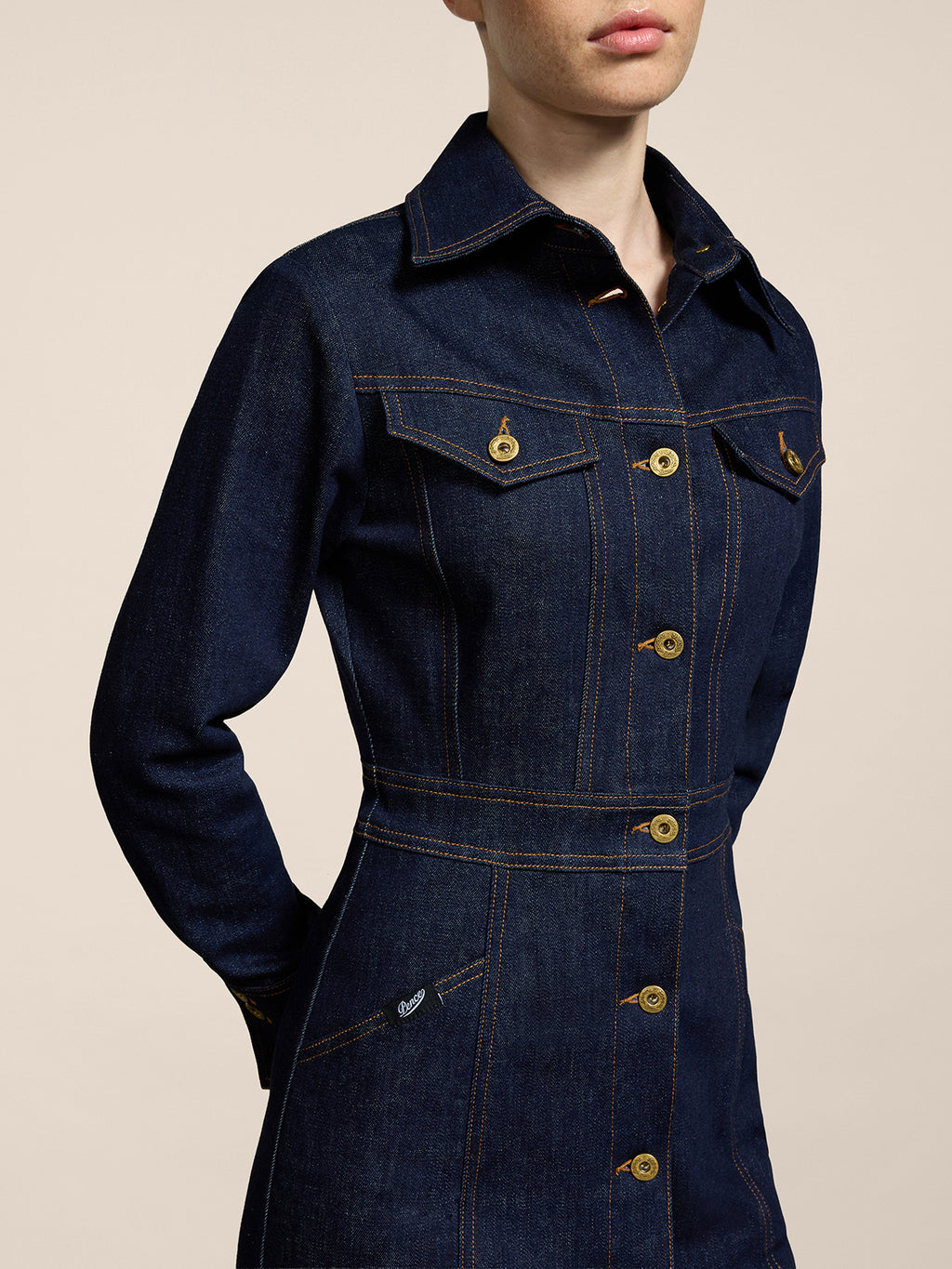 Abito lungo a maniche lunghe slim fit. Realizzato in denim blu scuro comfort, valorizza la silhouette senza rinunciare a stile e carattere. Le cuciture sottili richiamano lo spirito artigianale firmato Pence1979. Indossalo da solo o abbinato a stivali e una giacca leggera per un look daily-chic.