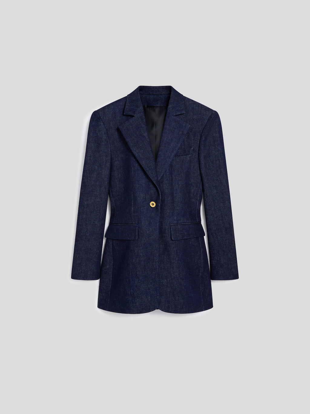 Monopetto revers specchio a un bottone, realizzata in denim blu comfort. Isabella si distingue per un design lineare, perfetto per accompagnarti in ogni occasione.