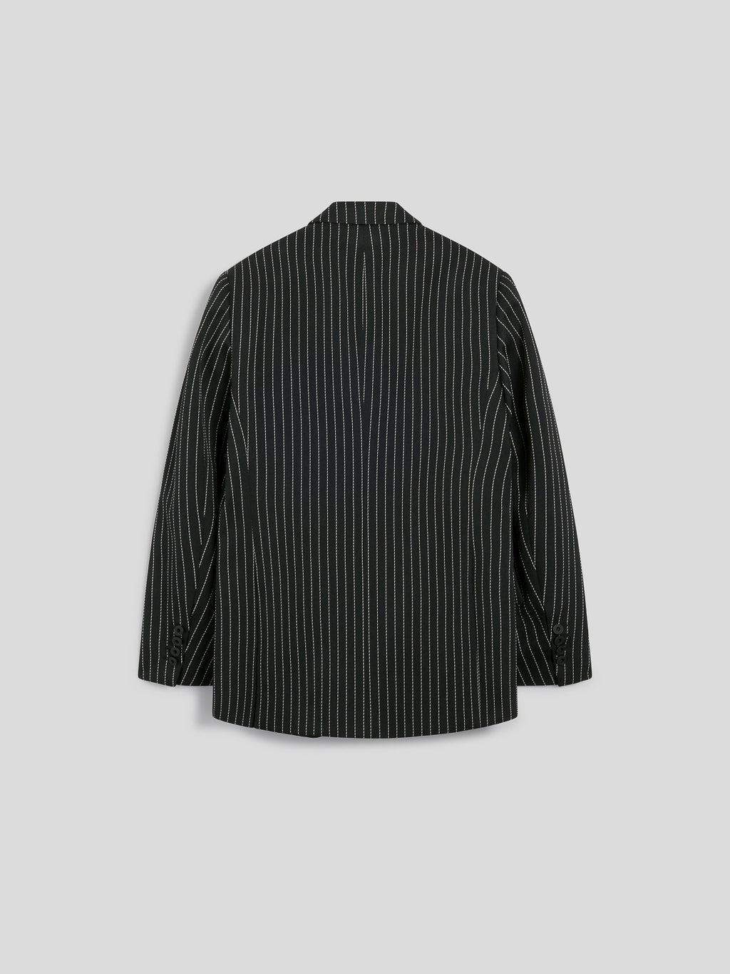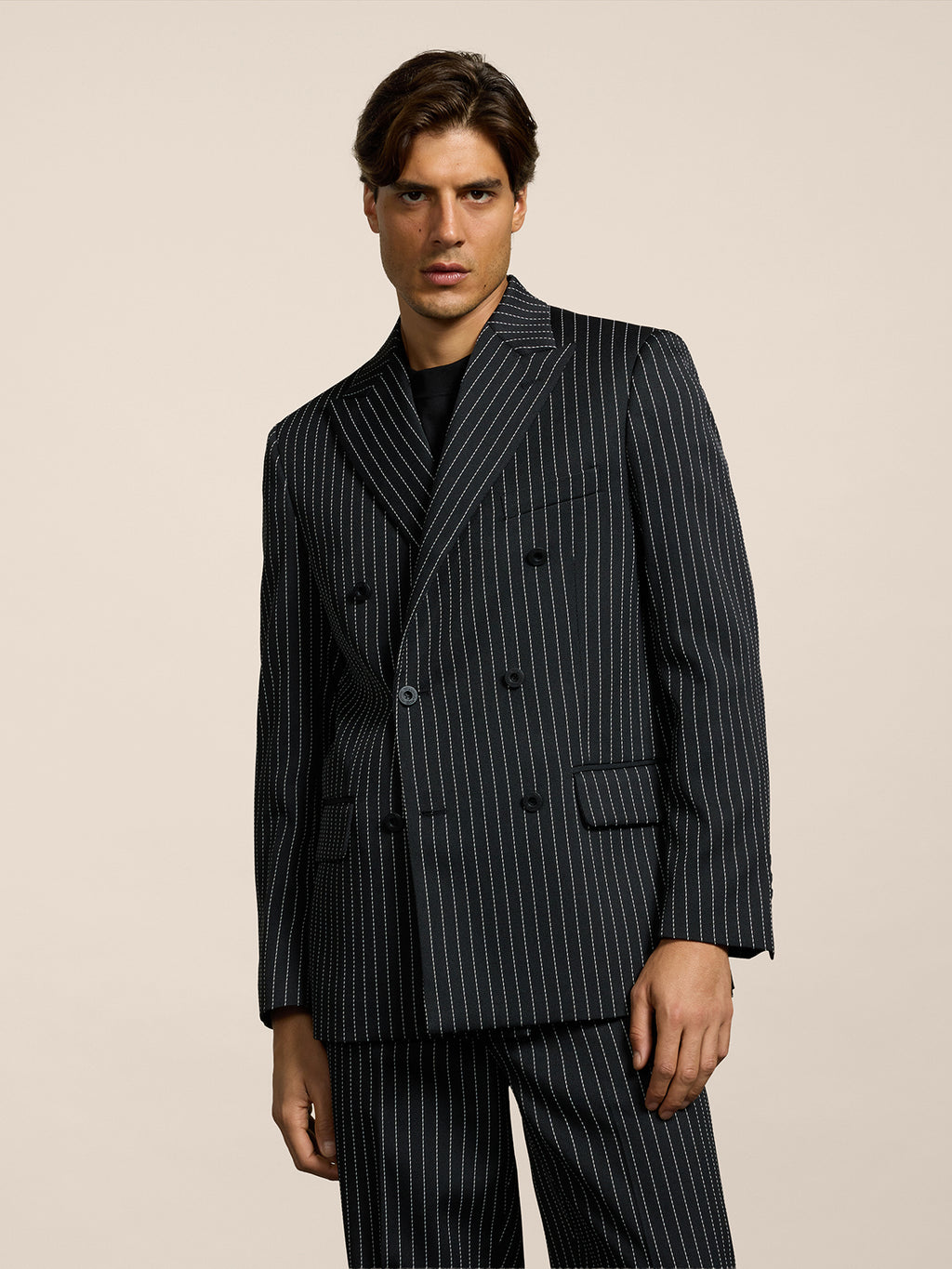 Blazer doppiopetto è un’icona di carattere e raffinatezza. Il revers a lancia e la lavorazione ne esaltano l’eleganza, unendo tradizione sartoriale e spirito contemporaneo. Il gessato sottile – fondo nero e riga bianca - conferisce profondità al look, la morbidezza del tessuto garantisce comfort e caduta impeccabile. Taglio elegante e pulito, ideale per abbinamenti formali o smart casual.
