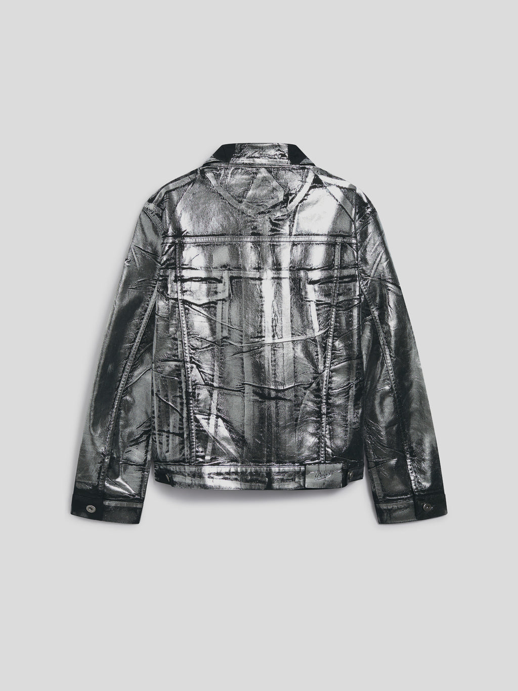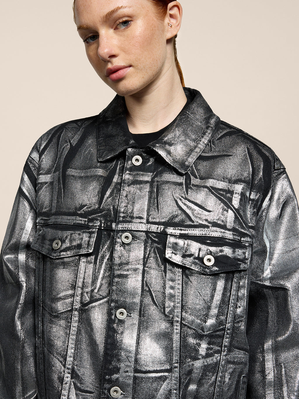 GIUBBINO UNISEX OVER FIT IN DENIM CON SPALMATURA METTALICA COLORE ARGENTO