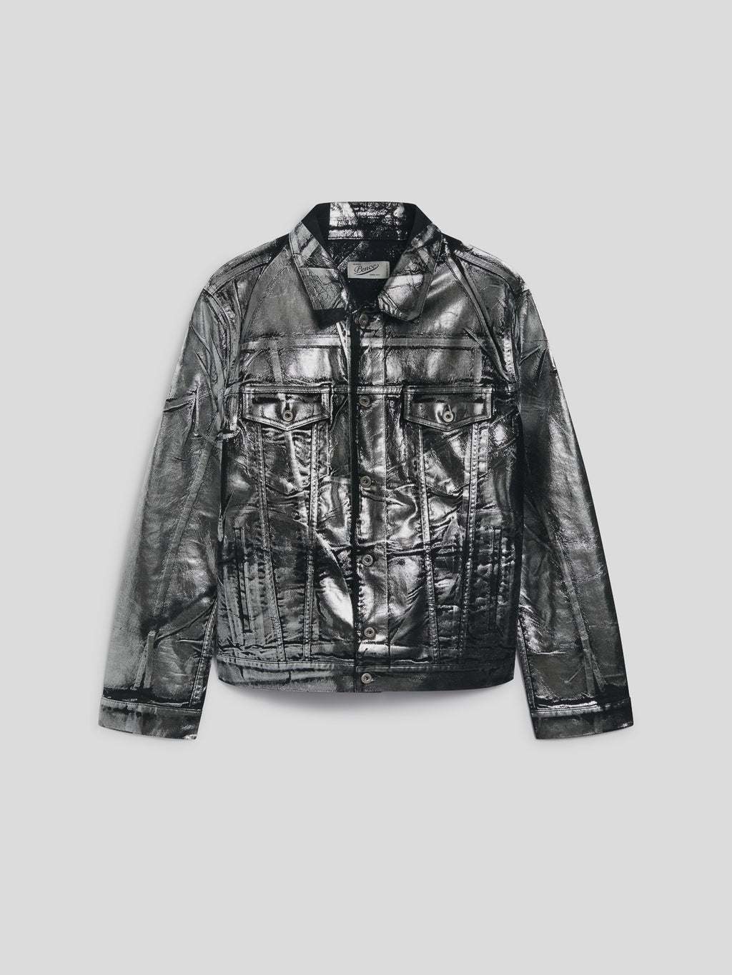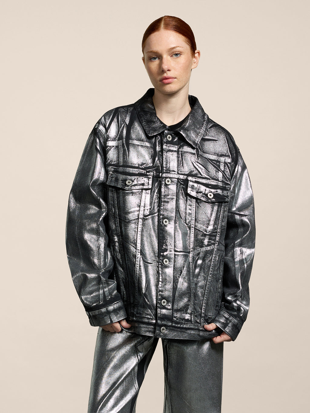 Giubbino unisex cinque tasche, vestibilità over, realizzato in denim ed impreziosito da spalmature metalliche che conferiscono una nota futuristica e contemporanea, perfetta per outfit urbani o serali. Taglio comodo e linee pulite rendono facile l’abbinamento con t-shirt o maglie.