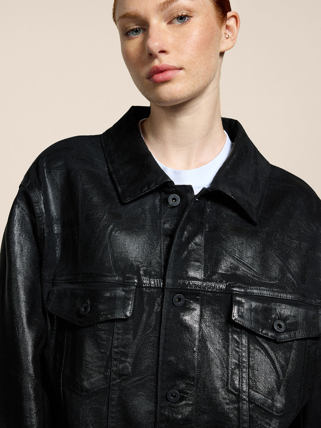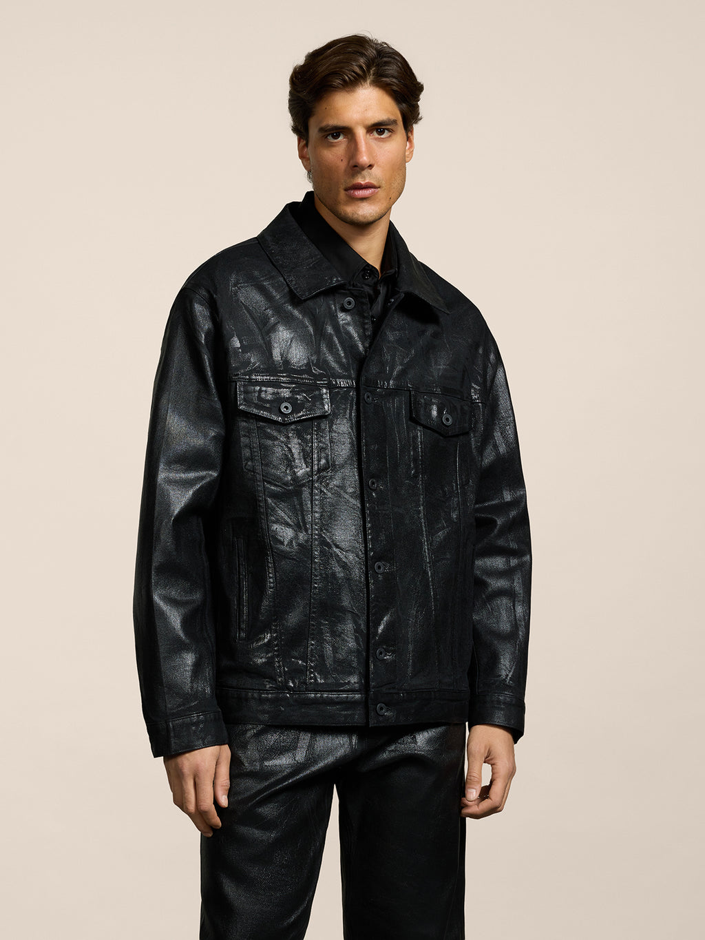 Giubbino unisex cinque tasche, vestibilità over, realizzato in denim ed impreziosito da spalmature metalliche che conferiscono una nota futuristica e contemporanea, perfetta per outfit urbani o serali. Taglio comodo e linee pulite rendono facile l’abbinamento con t-shirt o maglie.