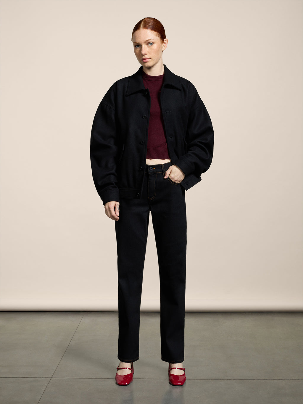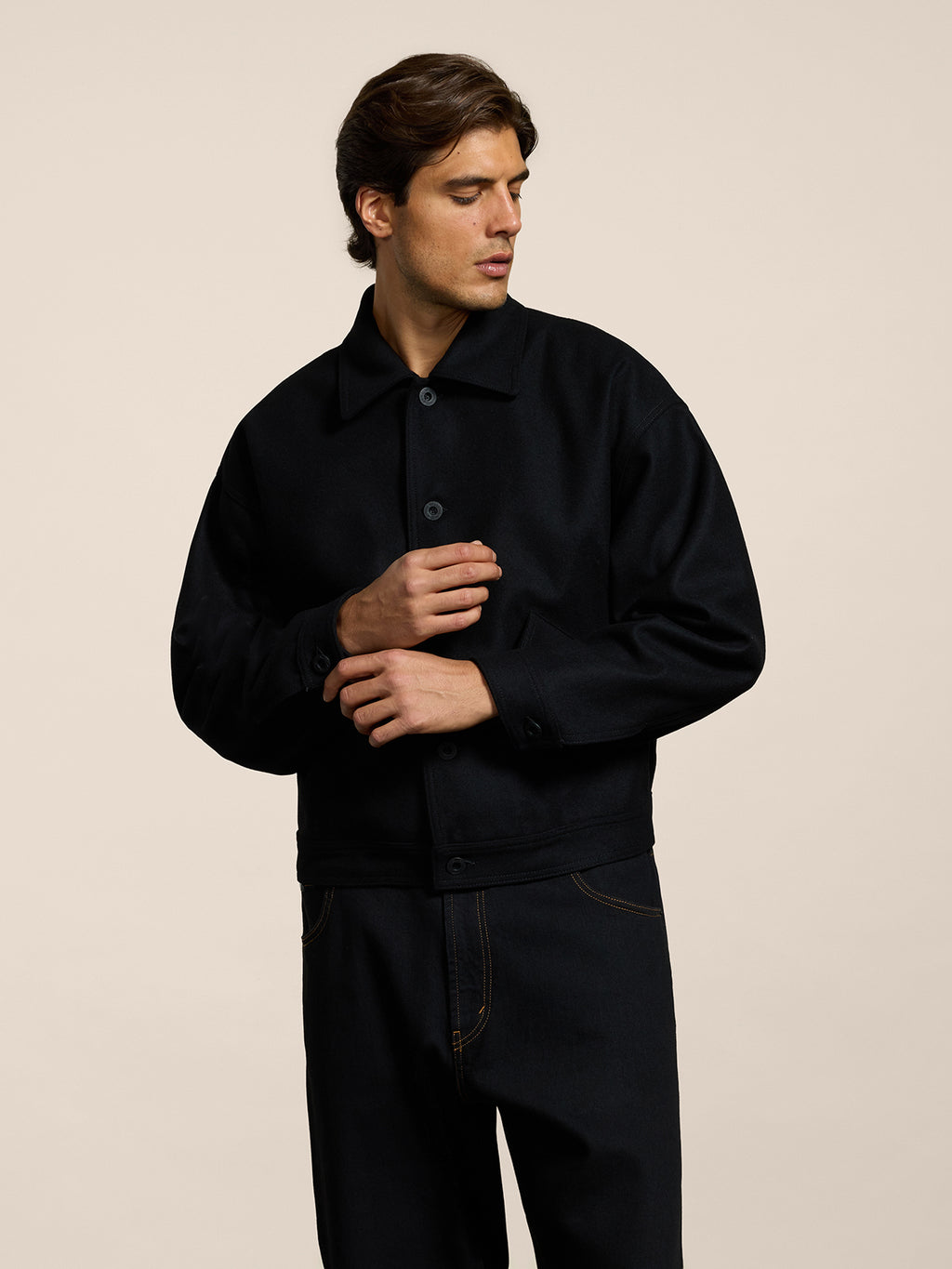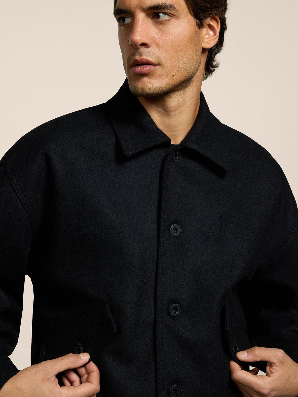 Giubbino unisex in panno firmato Pence1979 dalla vestibilità over. Linee pulite, chiusura discreta e tasche funzionali accentuano la cifra contemporanea del capo. Abbinalo a denim o tessuti pesanti per un look urbano e raffinato, capace di conferire carattere anche ad un outfit basico.
