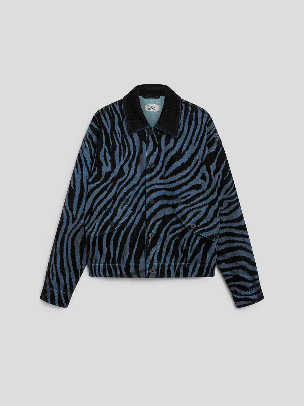 Giubbino unisex firmato Pence1979 dalla vestibilità over. Linee pulite, chiusura discreta e tasche funzionali accentuano la cifra contemporanea del capo. Il denim floccato zebrato regala unicità e carattere. Tasche laterali e cuciture minimal completano il capo.