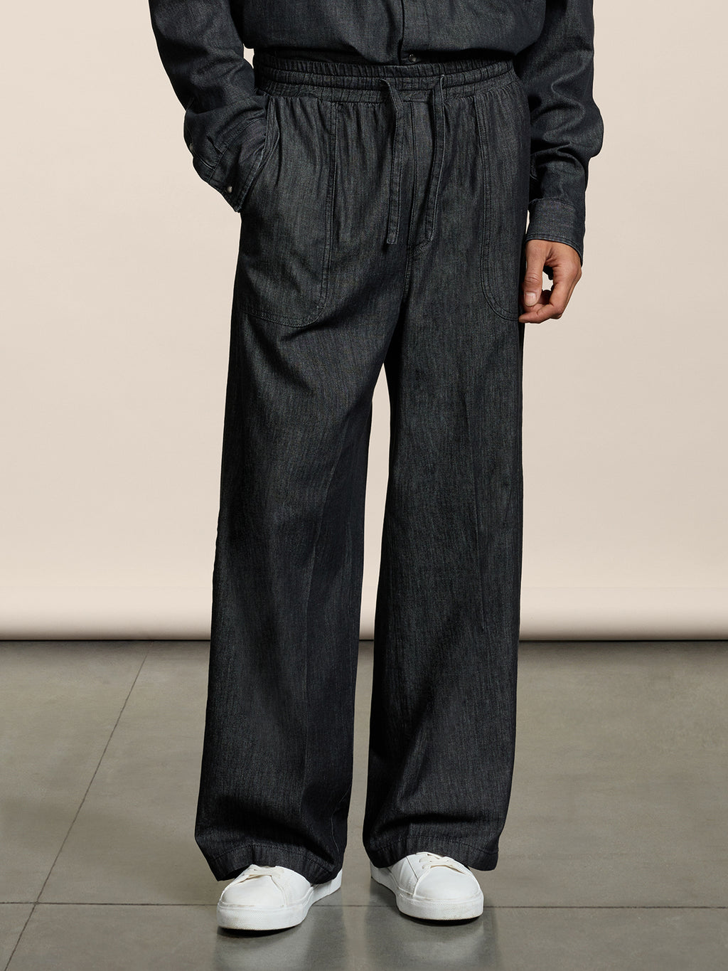 Pantaloni jogger unisex in chambray, dallo stile sportivo ma chic. La coulisse in vita assicura una vestibilità comoda e praticità quotidiana. Tasche laterali funzionali completano il look, da abbinare a sneaker e felpa per un outfit urbano e contemporaneo.