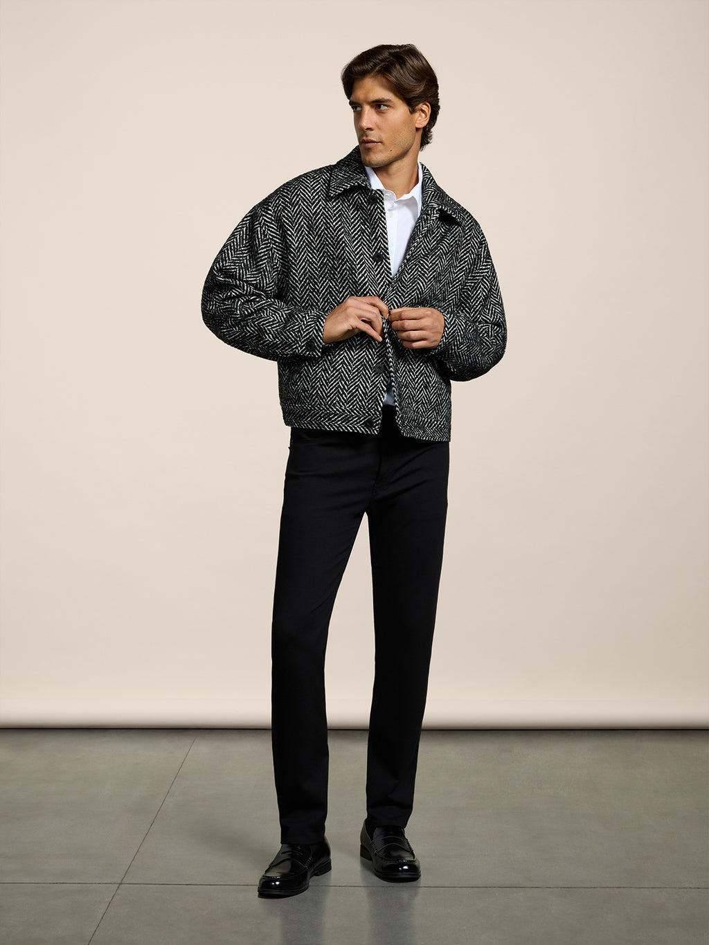 Il modello è alto 1.88, indossa la taglia 32.