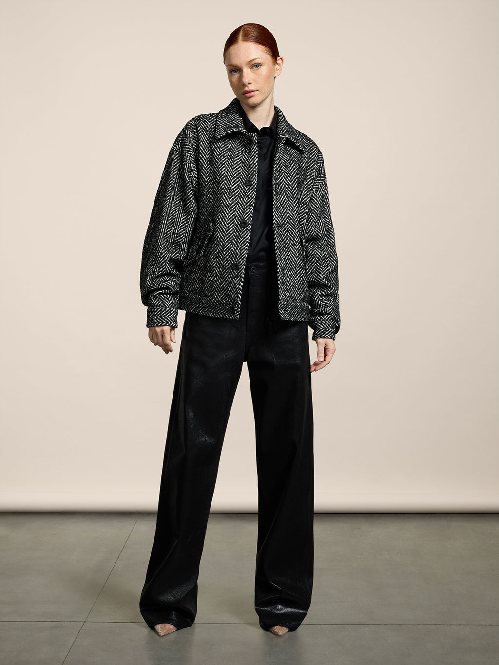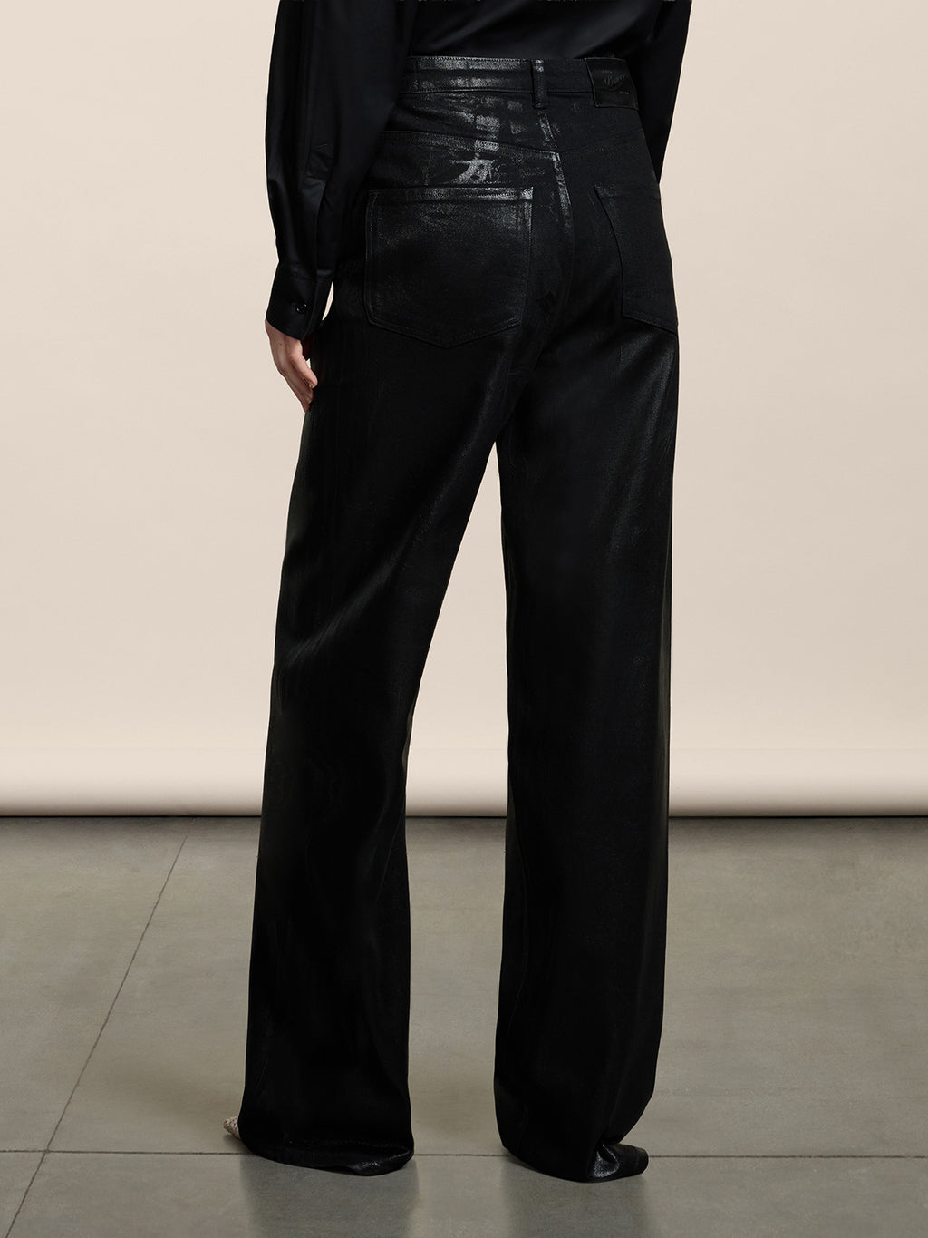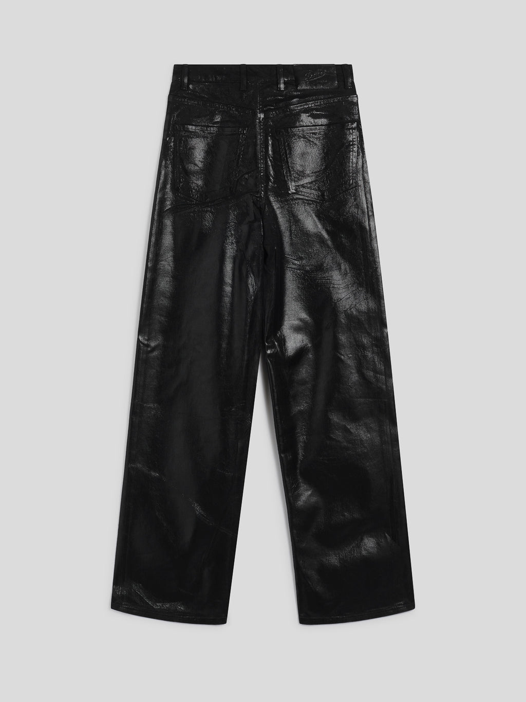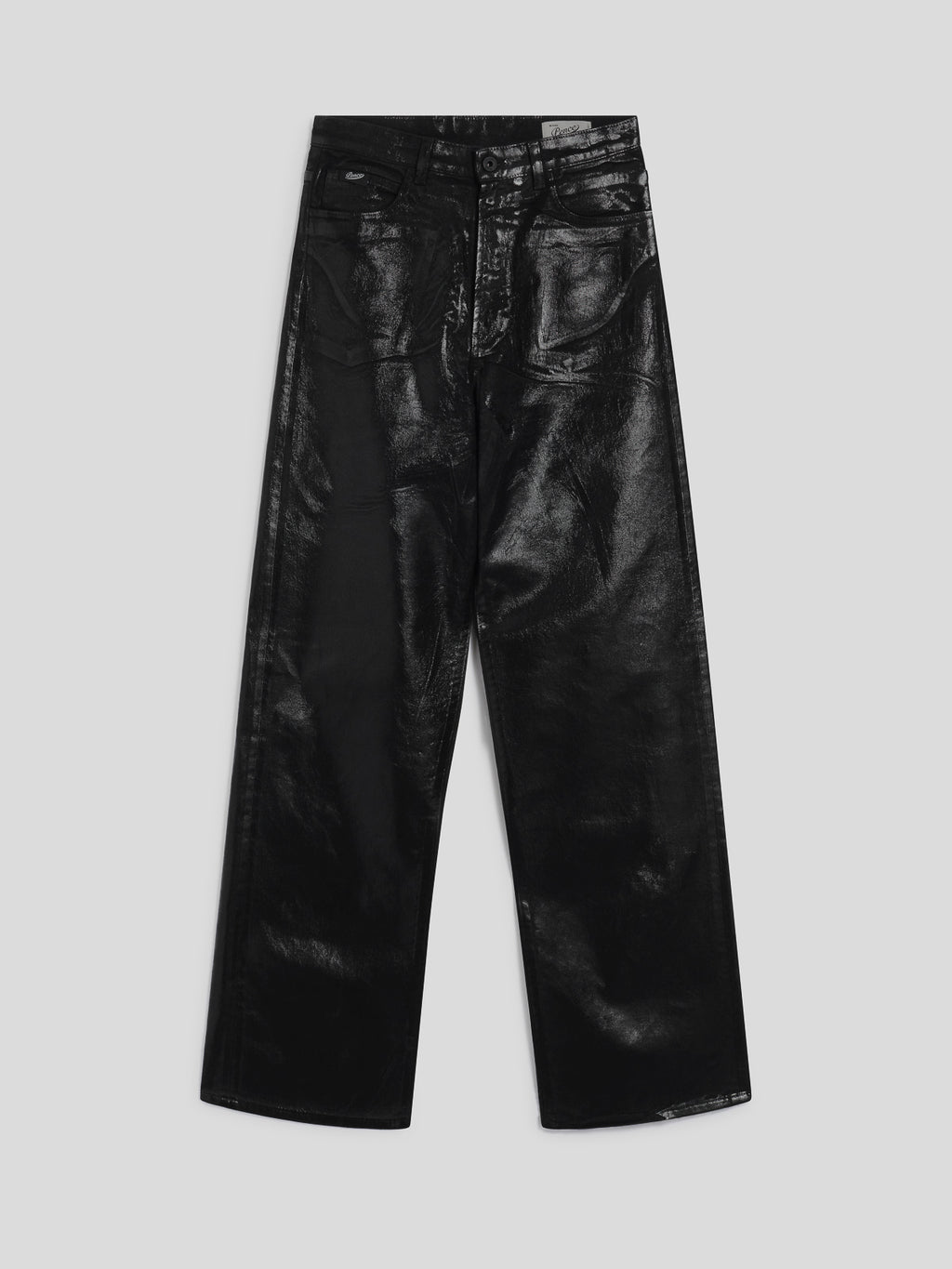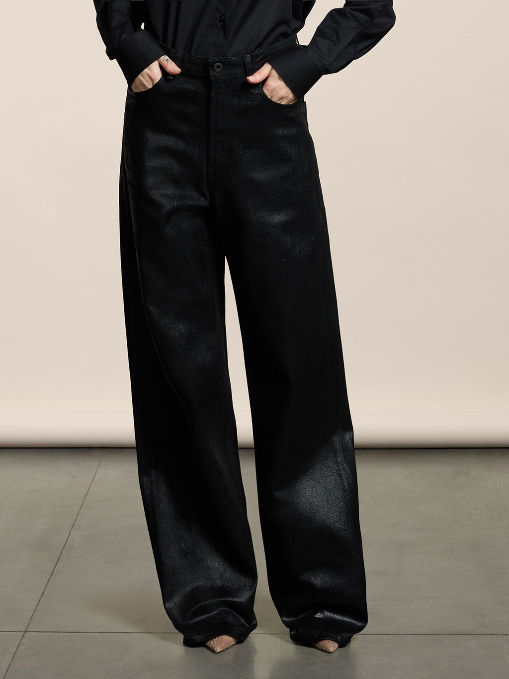 Pantalone cinque tasche, vita alta e gamba ampia: un modello iconico firmato Pence1979. Realizzato in denim con spalmatura metallica, presenta un finish audace senza rinunciare al comfort. Il taglio high-rise allunga la silhouette, mentre la linea ampia conferisce comodità. Prodotto in Italia con cura artigianale, attenzione ai dettagli per un effetto couture urbano firmato Pence1979.