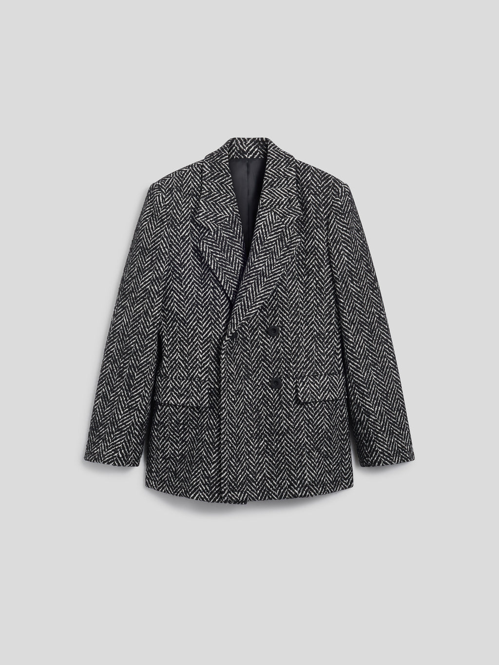 Peacoat doppiopetto dalla vestibilità regular, realizzato in tessuto spinato bianco e nero. Il doppio petto enfatizza la linea pulita e conferisce un tocco di sofisticazione, mentre la texture aggiunge carattere. Versatile sia con pantaloni sartoriali sia con denim, è il capo ideale per un look curato, in ufficio o nel tempo libero.